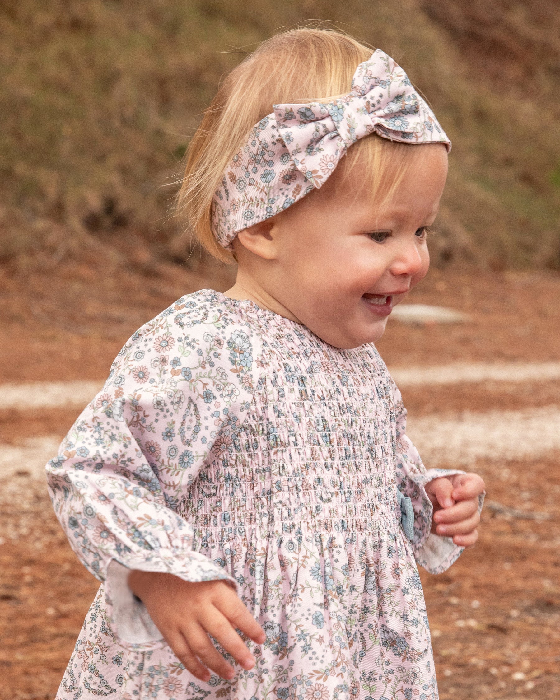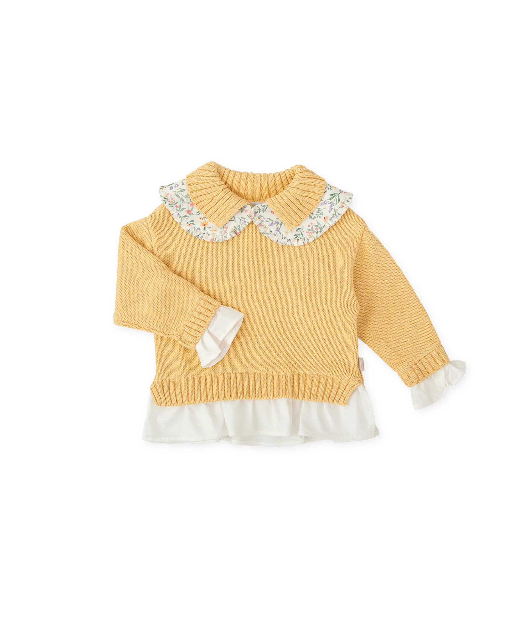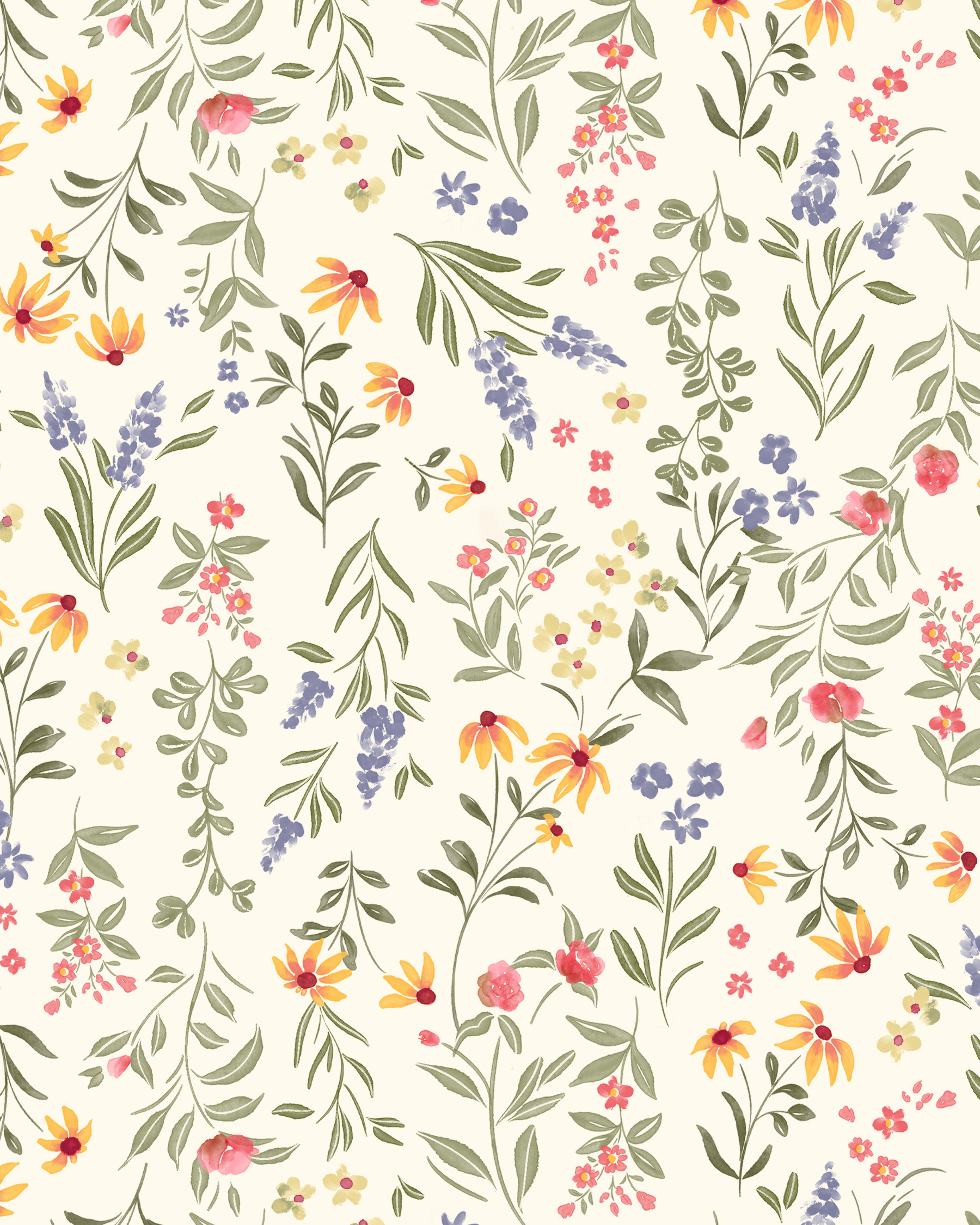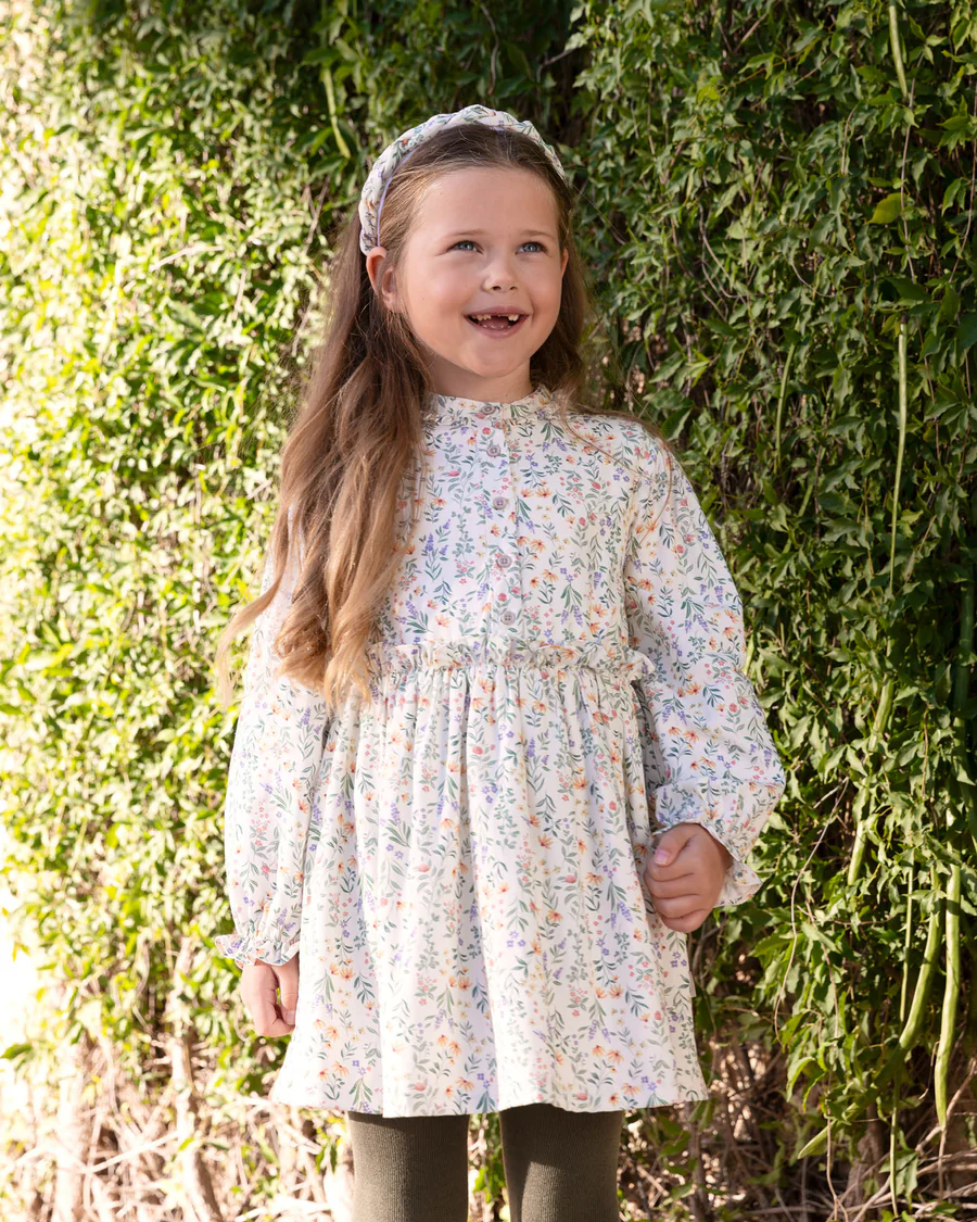 Estampado floral en tonos verdes, amarillos y violetas, para ropa de corte clásico de niña y bebé.