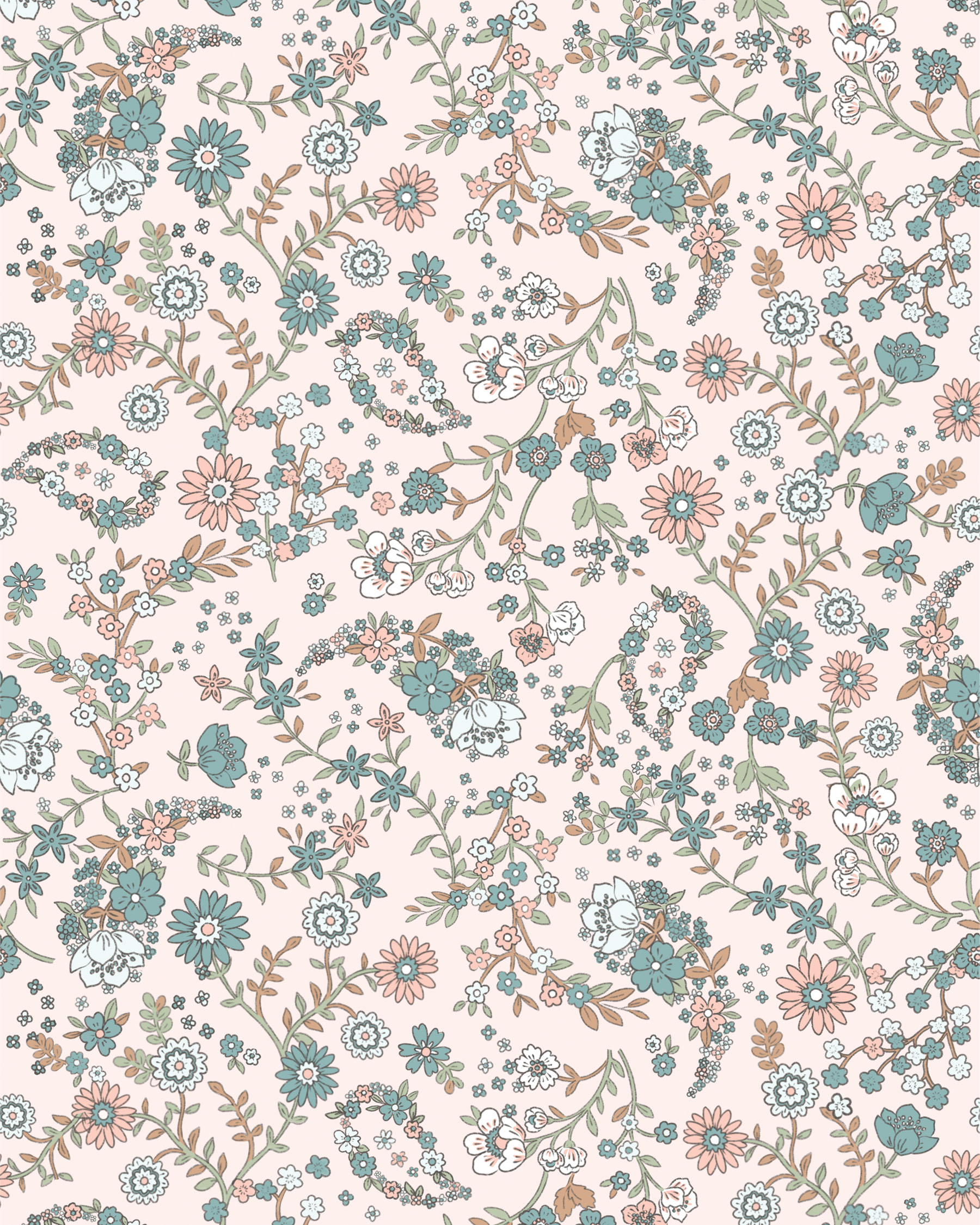 Estampado paisley floral en tonos suaves, rosas y azules, para ropa de corte clásico de niña y bebé.